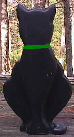 This is a 3 dimensional sitting cat with her tail wrapped around her and a Red or Green collar.